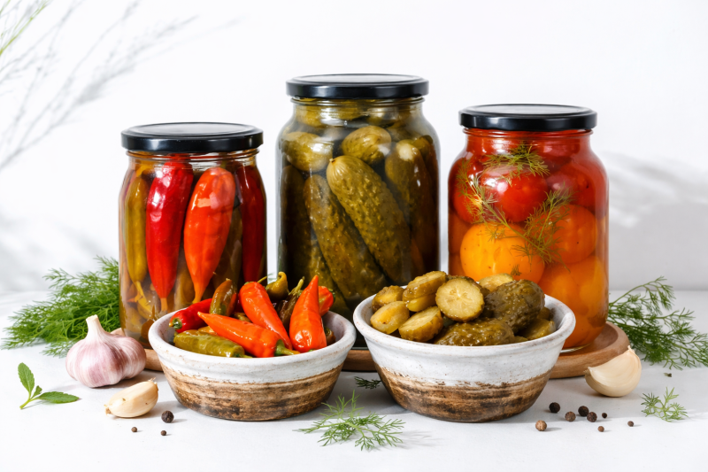 Подходит для огурцов, капусты, помидоров, свёклы. Молочнокислое брожение обогащает продукты пробиотиками и сохраняет витамины группы B и C. Важно использовать качественную соль и следить за чистотой тары.