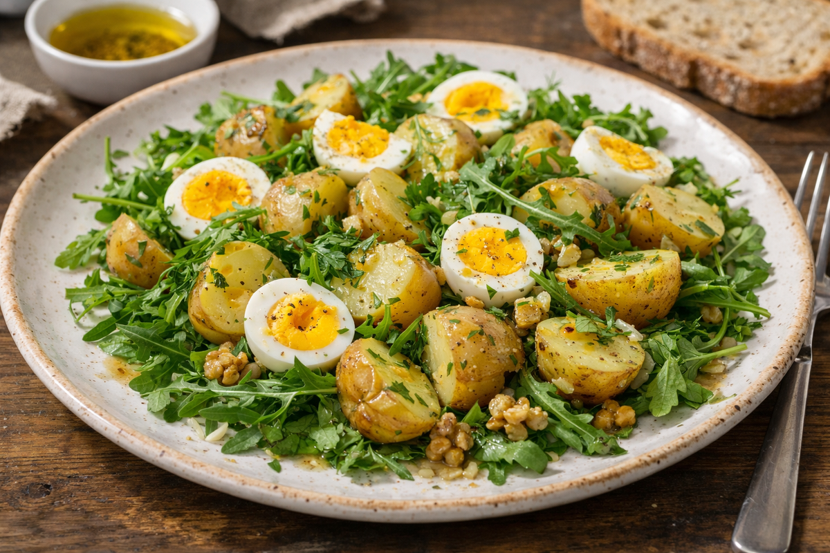 Этот салат — настоящая весенняя классика. Молодая картошка в мундире, свежая зелень и яйцо всмятку. Ничего лишнего, но всё нужное.