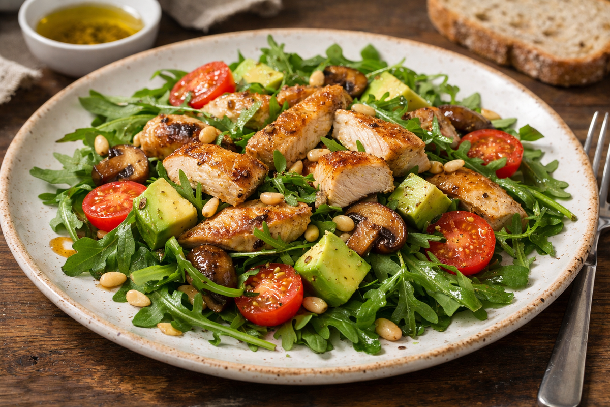 Этот салат хорош тем, что в нём есть всё для долгого чувства насыщения. Курица даёт белок, авокадо — полезные жиры, рукола — свежесть и клетчатку.
