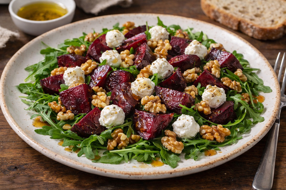 Свёкла в этом салате — сладкая основа. Козий сыр добавляет нежности и белка, а орехи — хруст и полезные жиры.