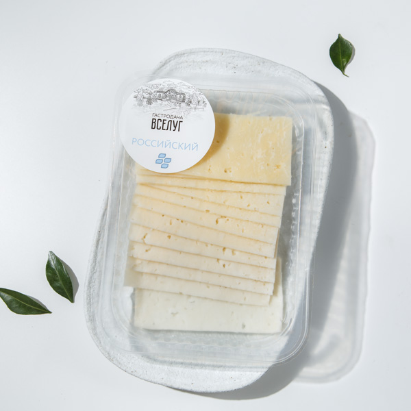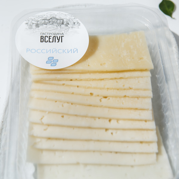 Сыр Российский имеет текстуру с дырочками, который обладает нежным сырным ароматом и вкусом с лёгкой кислинкой и остротой.