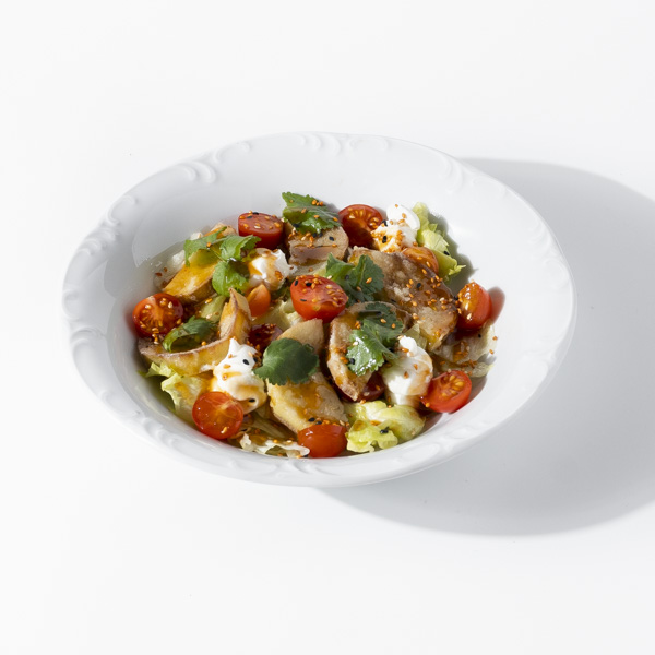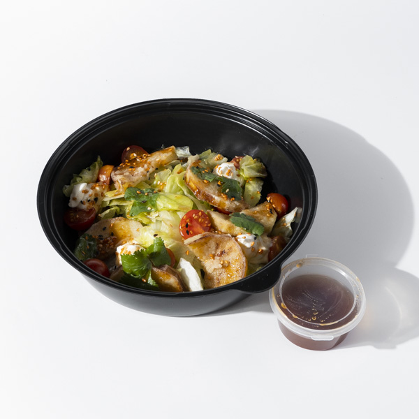 Состав:Салат Айсберг,баклажан,крахмал кукурузный,соль морская,помидоры черри, соус из баклажан ,крем творожный из креметте, кунжут.