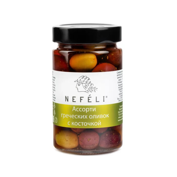 Ассорти оливок Nefeli с косточкой — это натуральные греческие оливки Каламата, оливки зелёные, белые и тёмные, маринованные в красном винном уксусе с добавлением морской соли и орегано.