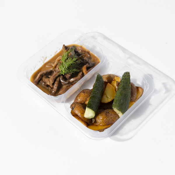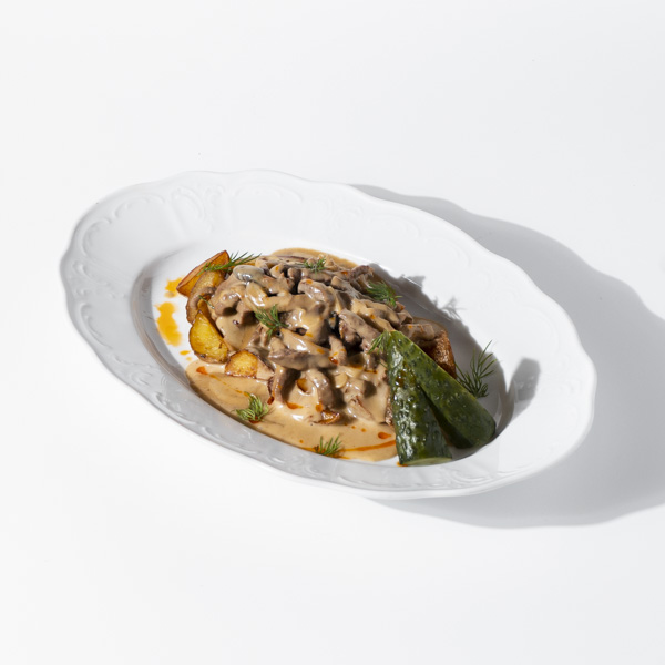 Ломтики говядины томятся в густом соусе, раскрывая интенсивный мясной вкус с деликатными сливочными нотами. Молодой картофель сохраняет плотную текстуру и лёгкую сладость, отлично впитывая соус. Ломтики огурчика добавляют блюду освежающую хрустящую ноту.