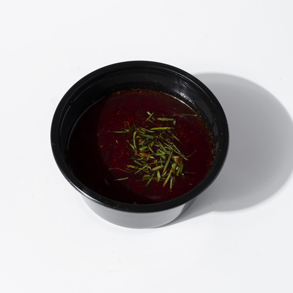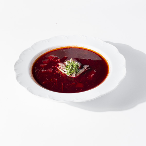 Бархатистый, глубокий бульон насыщенного бордового цвета с запахом томлёной утки. Мясо утки в супе имеет нежную текстуру в сочетании с насыщенной свёклой, ароматом чеснока и едва уловимым дымком. Пикантность овощей оттеняет щедрая порция свежего укропа и возвращает к традициям русской кухни с изысканным акцентом.