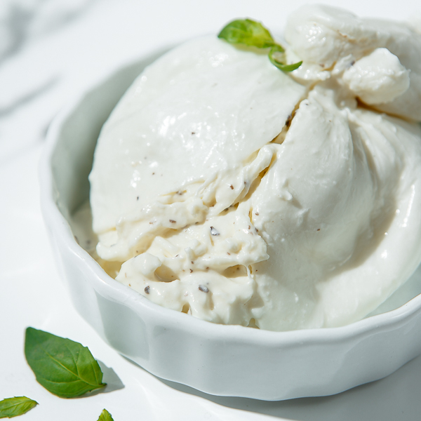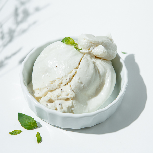 Перед подачей к столу сыр стоит немного нагреть на водяной бане (не вынимая из упаковки) или подержать при комнатной температуре 30 минут до употребления — буррата раскроет свой сливочный вкус и обретёт особенно нежную текстуру.