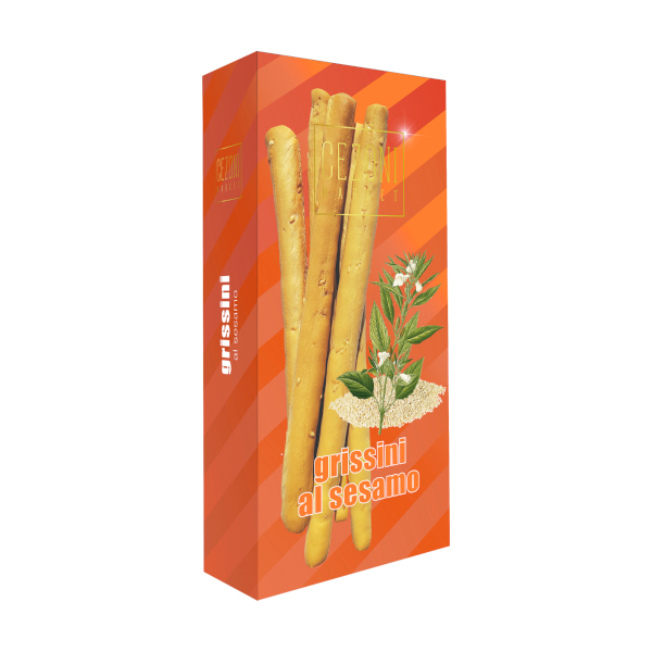 Хрустящие хлебные палочки гриссини с кунжутом, изготовленные по классическому итальянскому рецепту, имеют рассыпчатую текстуру и пшеничный вкус с тонкими восточными нотками.