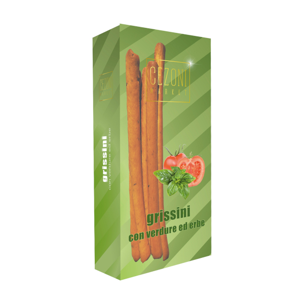 Хрустящие хлебные палочки гриссини с овощами и травами, изготовленные по классическому итальянскому рецепту, имеют рассыпчатую текстуру и пшеничный вкус с тонкими нотками орегано, базилика и розмарина.