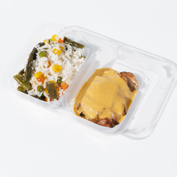 Состав:Бедро маринованное с имбирем,рис отварной,микс овощей,бульон овощной,соус карри сливочный,кунжут,лук зеленый.