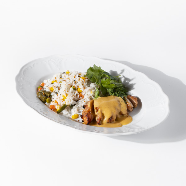 Куриное бедро маринуется в имбире и специях, приобретая выразительную азиатскую остроту и пикантность. Гарнир из рассыпчатого риса с овощами добавляет текстручный контраст и приятную сладость. Соус карри раскрывается пряной глубиной, проникая в каждый кусочек и связывая все элементы в один гармоничный ансамбль. Зелень освежает и завершает вкусовую картину.