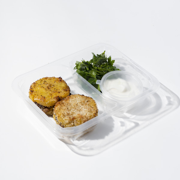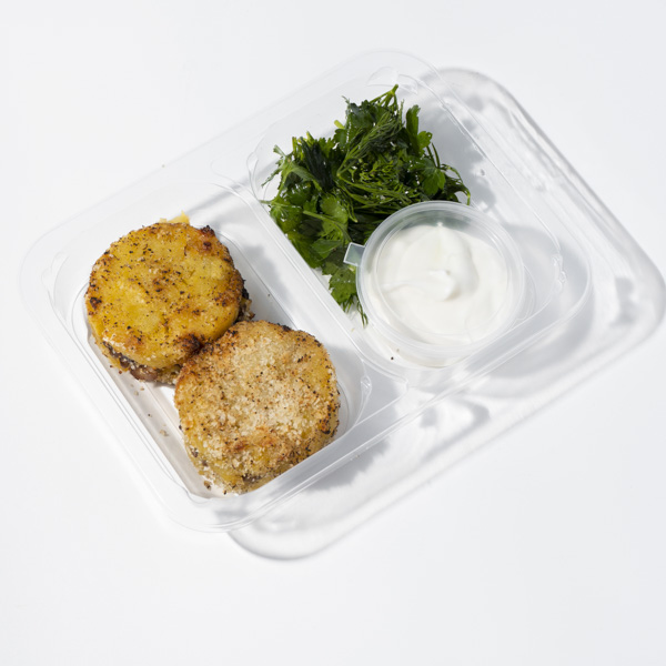Состав: Картофель, шампиньоны, вешенки, лук репчатый, масло растительное, сухари панировочные, специи ( соль, перец), сметана соевая, зелень.