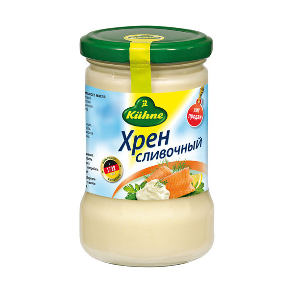 Состав: хрен, рапсовое масло (22%), взбитые сливки (10%), спиртовой уксус, вода, глюкозно-фруктозный сироп, сахар, молочная сыворотка, соль, загустители: гуаровая камедь и ксантановая камедь, регулятор кислотности: лимонная кислота, антиокислитель: пиросульфат натрия, краситель: диоксид титана, натуральный ароматизатор: сливки.