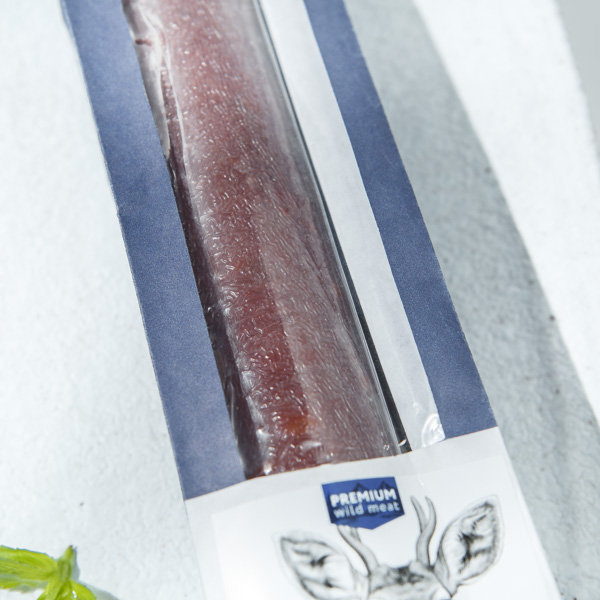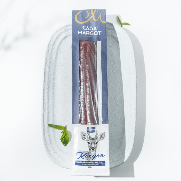 Эксклюзивная сыровяленая колбаса из Косули категории А (Премиум) изготовлена только из натурального сырья и специй (смеси различных перцев, сушёные травы, соль). Дым для копчения получается при тлении смеси буковой и ольховой щепы. Известно, что дикое мясо Косули - экологически чистое, богато питательными микроэлементами, гипоаллергенно, содержит минимальное количество холестерина, подходит для диетического питания. Мясо косули содержит множество микроэлементов, которые необходимы для здоровья человека. Животное питается здоровой растительной пищей, поэтому его мясо не содержит вредных веществ. Очень вкусный и полезный деликатес.