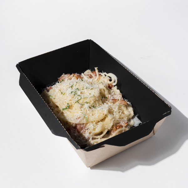 Состав:Паста,бекон с/к свиной,вино,соус бешамель перечный,бульон куриный,масло растительное,масло чесночное,сыр Эдам.