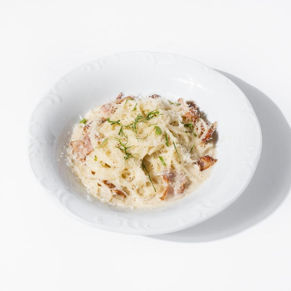 Аль денте паста соединяется с нежнейшим сливочно-яичным соусом, в который проникает копченый аромат поджаренного бекона. Кусочки бекона дарят блюду пикантный, слегка солоноватый вкус и легкую хрустящую текстуру. Пармезан дополняет композицию и придаёт истинно итальянский характер.