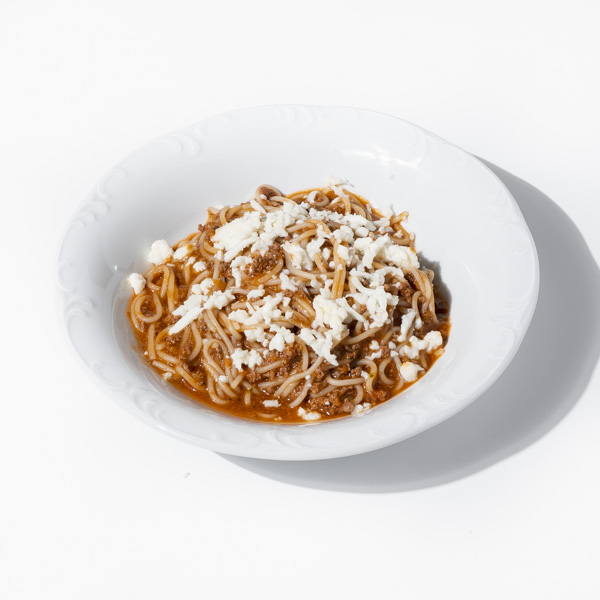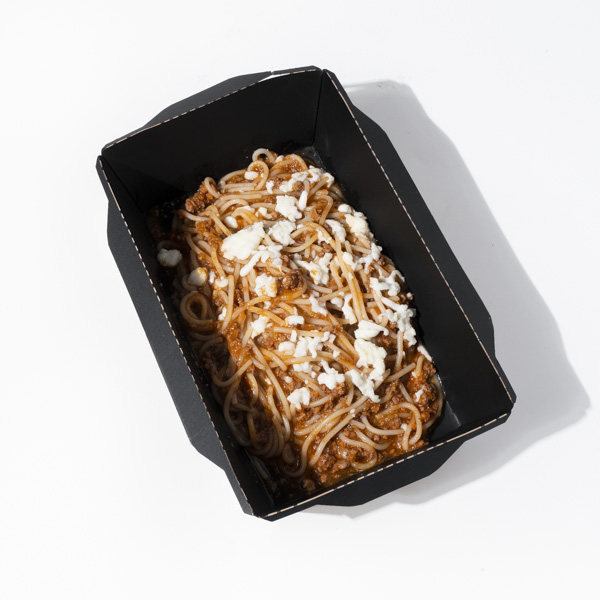 Состав:Паста,Болоньезе из вырезки,бульон овощной,сыр моцарелла,масло чесночное.