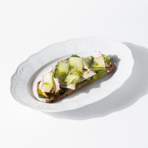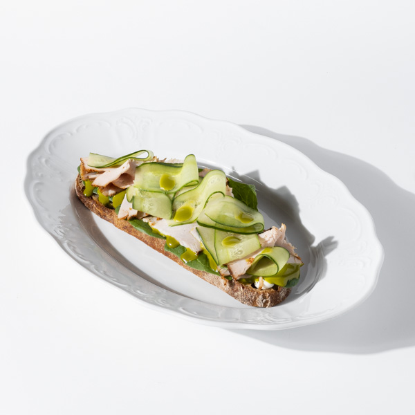 Соста: Хлеб тартин,сыр креметте,шпинат,филе индейки сувид,огурцы свежие,масло сливочное, масло укропное,яйцо куриное,сок лайма,горчица,соль морская.