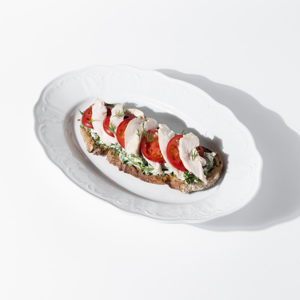 Хлеб покрыт слоями сочной курицы и томатов на подушке из зелени в сочетании с соусом блючиз. Сыр придаёт характерную остроту и кремовую плотность, а свежие овощи и зелень оживляют текстуру. Тартин отлично держит начинку, раскрываясь хрустящей корочкой и нежным центром. Это баланс пряности, сыра и деликатного куриного мяса.